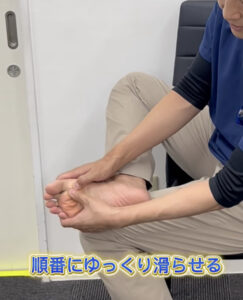 1. 足の指先からかかとに向かって、指の付け根のふくらみ部分をやさしく撫でるように滑らせます。