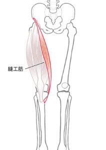 縫工筋は、太ももの中央よりもやや内側にある筋肉です。指で押すと少しへこむ柔らかい部分が目印になります。