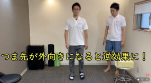 - つま先が外に開かないように、内股気味にするぐらいの意識でまっすぐをキープする