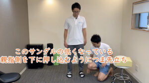 まず、サンダルを履いていない状態で片足立ちをしてもらいました。右足では安定して立てましたが、左足では少しぐらつきが出ました。さらに、左足で片足立ちをしている状態で上から肩を押さえると、耐えきれずに崩れてしまいました。